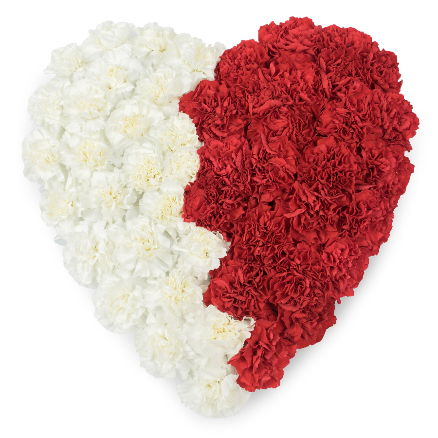 Presenting a sophisticated heart-shaped bouquet of white and red carnations, designed to impress and convey deep emotions. This arrangement is perfect for any occasion that requires a touch of elegance.